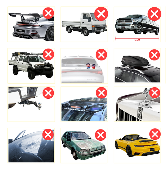 Vehicles may not be suitable for washing if they have low ground clearance, oversized body modifications, unusually wide fittings, roof-mounted accessories above standard height, or external attachments that could affect safe passage through the wash system.